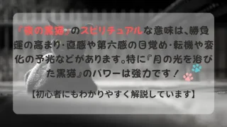 「夜の黒猫」のスピリチュアルな意味は、勝負運の高まり・直感や第六感の目覚め・幸運や守護の象徴などがあり、特に「月の光を浴びた黒猫」のパワーは強力と言われています。また、運気の流れが一気に加速する可能性が高いです。