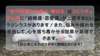 「夜の白猫に出会う・横切る」はスピリチュアル的に『結婚運・恋愛運』が上昇するというジンクスがあります!また「悩みや疲れを癒し、浄化する力」があると言われています。