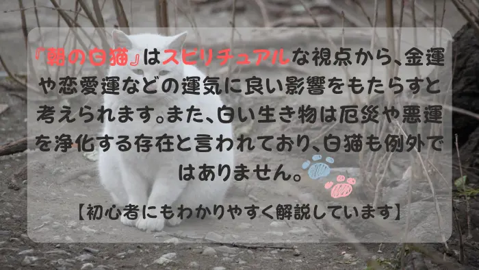 - 朝に白猫と出会うことは、幸運や新たなスタートのサインである。